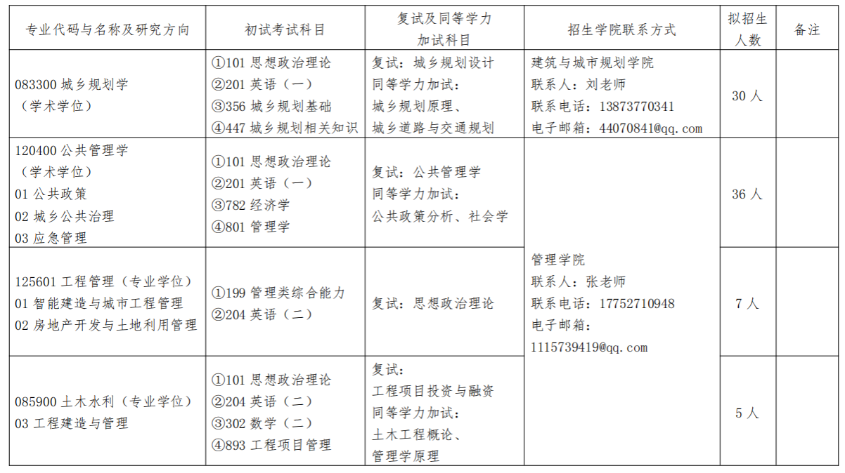 (一)学术学位硕士研究生招生专业:城乡规划学、公共管理学。