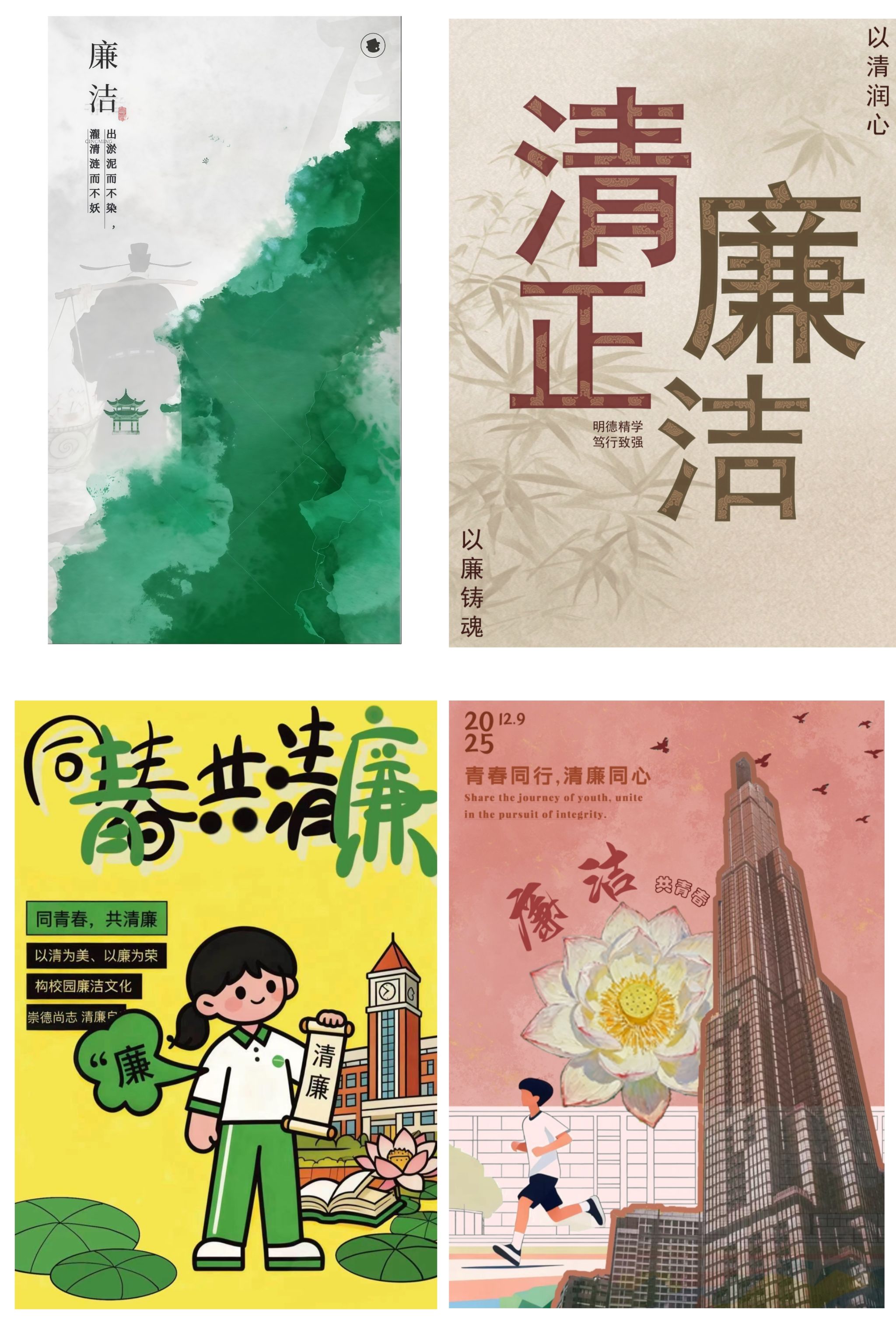 为让学生在创作实践中深化对廉洁精神的理解,学院同步发起“同青春,共清廉”廉洁文化艺术作品征集活动,面向全院学生征集书法、海报两类作品,鼓励学生以专业所长诠释廉洁内涵,让“廉洁之美”通过艺术语言看得见、触得着。