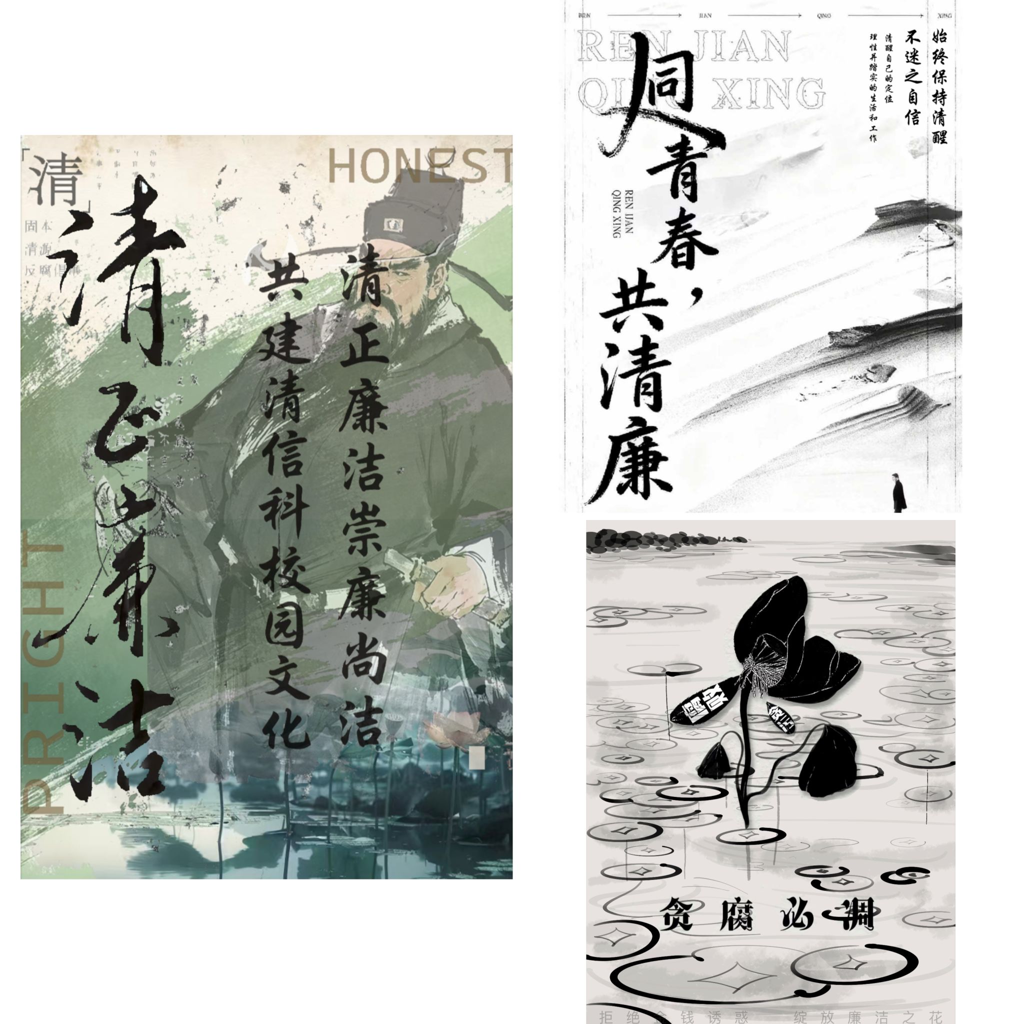活动启动后,美院学子踊跃参与,将廉洁理念与艺术创意深度融合,涌现出一大批主题鲜明、形式新颖的优秀作品。在书法作品中,既有“粉身碎骨浑不怕,要留清白在人间”等经典诗句的笔墨演绎,也有学生原创的“青春当守廉,匠心筑初心”等廉洁格言,楷书的端庄、行书的流畅、隶书的古朴,让廉洁思想在笔墨间传递;在海报作品中,学生们运用夸张、对比、象征等设计手法,或通过“‘清正’天平对抗‘贪欲’砝码”的视觉隐喻,或通过“青春校园与廉洁元素”的场景融合,生动诠释“廉洁与青春同行、与专业相伴”的理念。