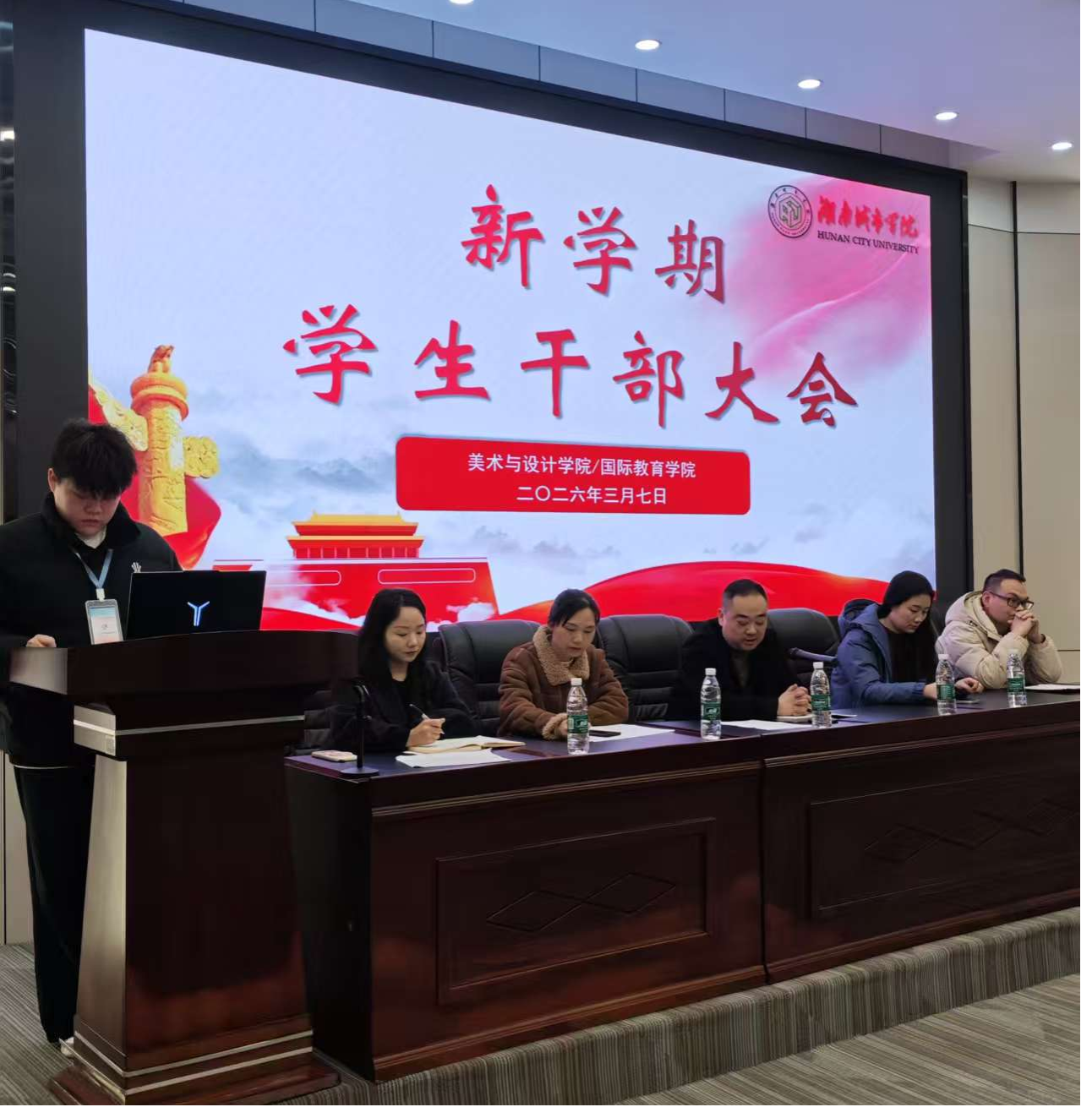 春启新程,奋楫扬帆。为锚定新学期工作目标、明晰责任分工,保障美院各项工作平稳有序开局,2026年春季学期伊始,美术与设计学院/国际教育学院隆重召开新学期第一次学生干部大会。院党委副书记李鑫、学工办文静、李柏、杜鑫茹和高慧鑫出席本次会议,团学会干部、各班班委参会。会议由院团委学生会办公室委员胡江涛主持。
