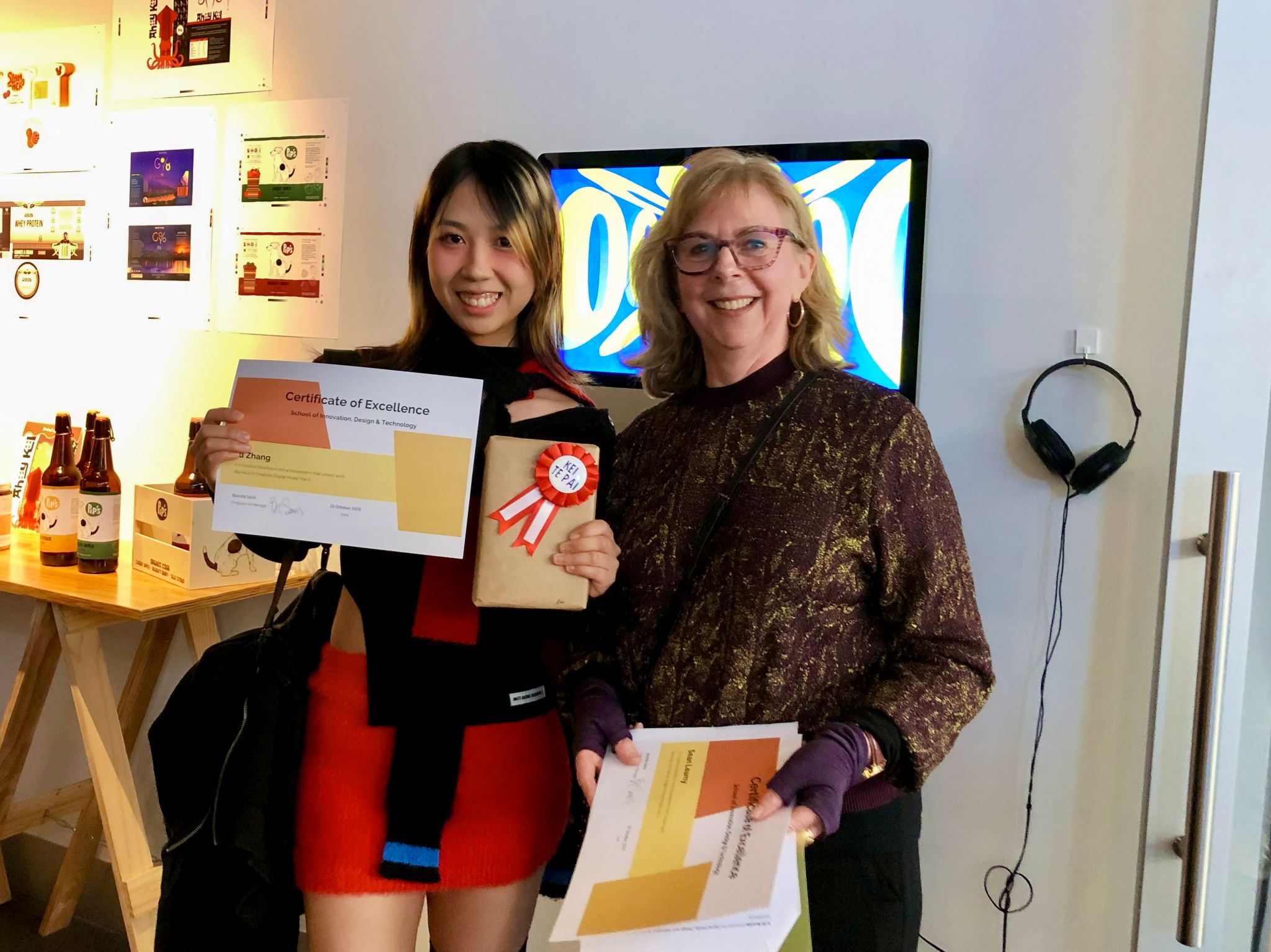 近日,我校与新西兰惠灵顿维特利亚理工学院合作的视觉传达设计专业中外合作办学项目传来喜讯:本专业学生张璐在刚结束的评选中脱颖而出,荣获“最佳设计学生奖”。作品展开幕式上,张璐同学在师生见证下接受了获奖证书。
